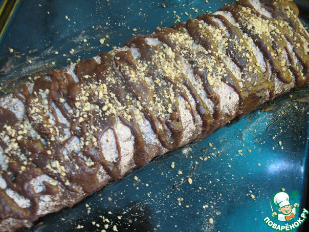 • Чтобы рулет не был "голым", смазала взбитыми сливками + немного сахарного песка. После полила растопленным шоколадом.