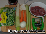 Лук нарезать мелкими кубиками, морковь и сельдерей - соломкой. Черешковый сельдерей и порей промыть. Сельдерей нарезать ломтиками, порей - тонкими полукольцами. Картофель очистить и нарезать брусочками.