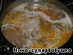 Влить в кастрюлю горячий бульон (или воду), добавить уксус и сухую травку, довести суп до кипения и варить на маленьком огне 15 минут.