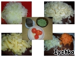 Для начала подготовим наши овощи. Лук мелко режем, морковь трем на крупной терке, перец соломкой, капусту шинкуем, картофель брусочками, помидоры ошпариваем, снимаем кожицу, режем мелко.