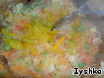 Разогреваем в кастрюле растительное масло, опускаем в него лук и немного тушим, но не жарим. Добавляем морковь, еще чуть тушим, затем отправляем болгарский перец, горошек и помидоры, тушим еще минут 5.