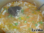 Когда суп закипит, добавляем картошку (можно и без нее, но у меня муж не понял бы суп без картошки). Варим до готовности картофеля. В процессе определяемся с густотой, если нужно разбавляем кипятком.