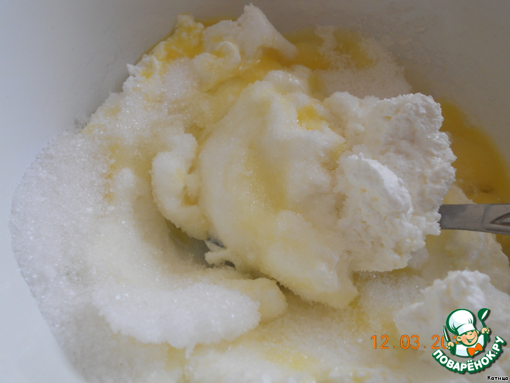 В чашке смешать творог, яйца и сахар.