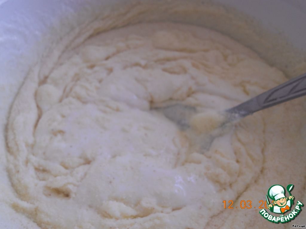 Добавить манку и соду, хорошо все перемешать до однородной массы.