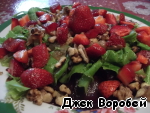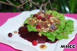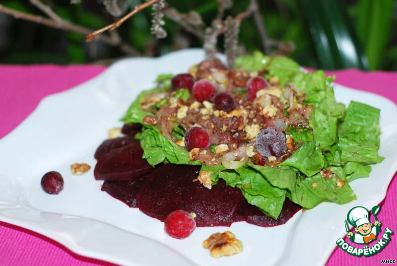 Листья салата смешать с соусом и выложить на свеклу. Посыпать орехами и малиной.