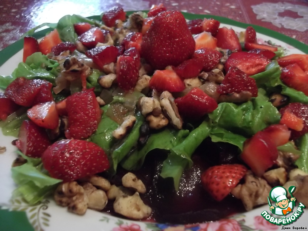 Листья салата вымыть и обсушить. Лук меленько нарезать и слегка подрумянить с раст. маслом. Добавить малинового уксуса и убрать с плиты.