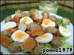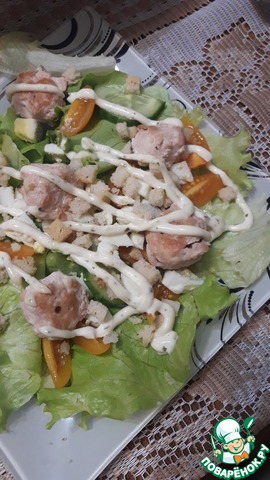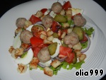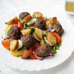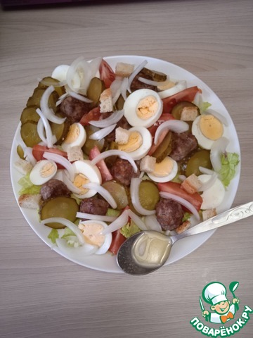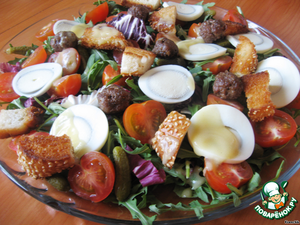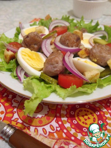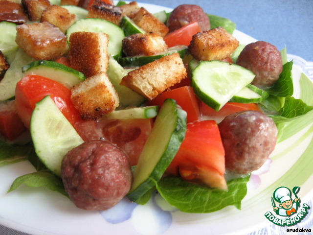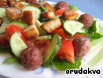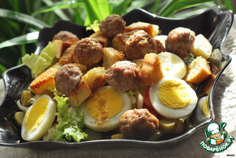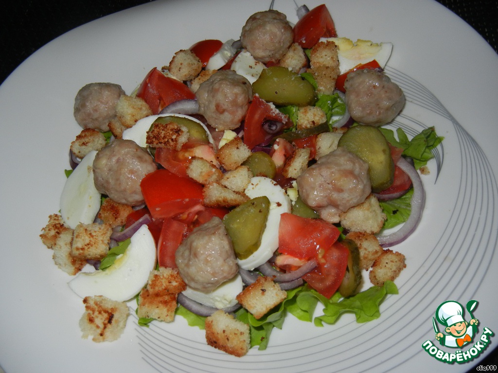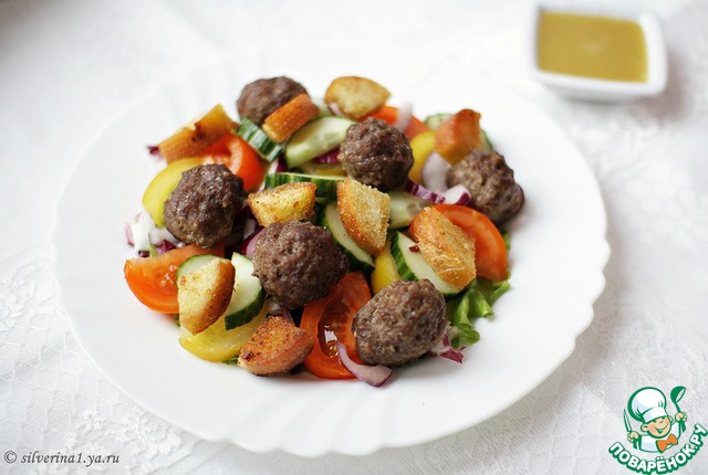 Салат подается с горячими фрикадельками. Перед едой залить салат соусом и перемешать. Можно посыпать крупной солью и перцем.