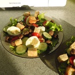 Начинаем сборку салата: на тарелку, в которой будете подавать салат, выложить салат (если листья большие, то разорвать их руками). Выложить нарезанные помидорки, огурец пластинками, яйцо.