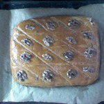 Накрываем вторым пластом теста и все повторяем еще раз. Когда будете укладывать очередной слой, слегка прихлопывайте по нему, чтобы вышел воздух. Теперь раскатаем больший из наших кусочков - это верхний слой. Накрыть им всю пахлаву, хорошенько скрепить края и все защипы завернуть под пахлаву. Получается вот такой гладкиий пирог.