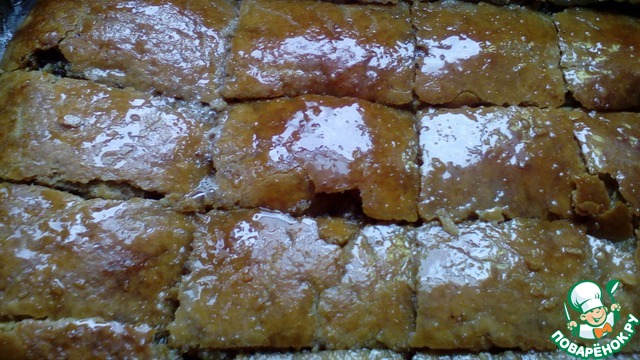 Достать пахлаву и обильно смазать медом, особенно места разрезов и орешки. Убрать в духовку еще на 5 минут. Достать и остудить. Холодную порезать на кусочки и наслаждаться дивным вкусом.