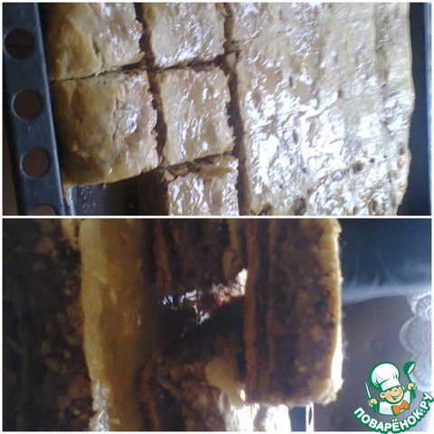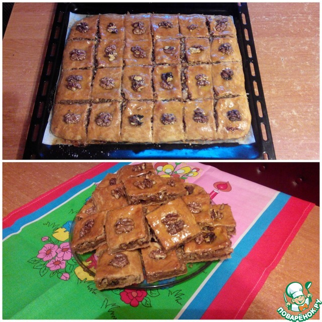 На счет орешков сверху... я их с медом перемешиваю, а за 5 минут до готовности , я и пахлаву медом смазываю и орехи выкладываю. Все отлично получается!