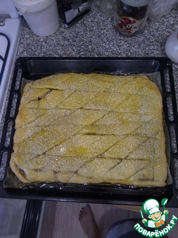 Достаем по одному шарику, раскатываем толщиной 0,5 см, если у вас стандартный противень, то это как раз на него. Укладываем пласт теста с небольшим бортиком, смазываем его белком и равномерно распределяем половину начинки.