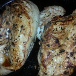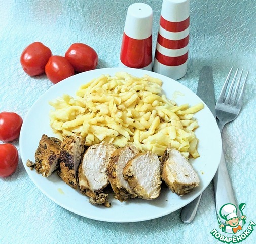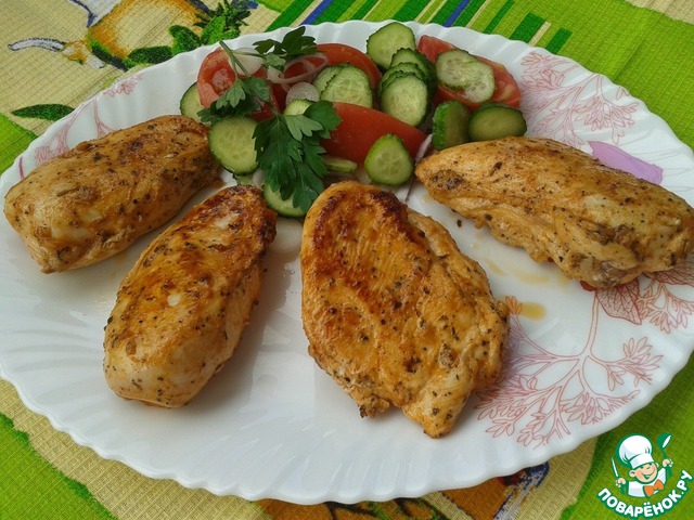 После того как грудки промариновались, отсушить их слегка полотенцем и можно жарить. По три минуты с каждой стороны. Не пересушите. Все очень просто.