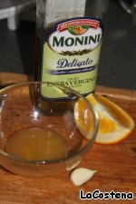 Королевские креветки разморозить и приготовить для них маринад: чеснок, оливковое масло, соевый соус и 20 мл. апельсинового сока.
