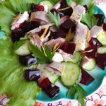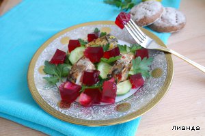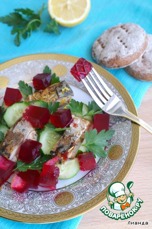 Салат с запеченной рыбой и свекольным желе. Удивлены… Когда я увидела этот салат, в первую очередь обратила внимание на фотографию – уж очень красиво смотрятся кусочки яркого желе на общем фоне. А приготовив, поняла, что желе здесь не только украшение, но и прекрасное дополнение к рыбе… После ужина ни одного алого кусочка в тарелках не осталось… Идея рецепта взята у olgavb osa.