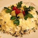 В середину салата положить веточки петрушки, а сверху выложить желтки.