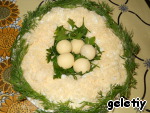 Лук я правда не положила, а положила два зубчика чесночка, ножом погубила... Некоторые в нашей семье не переносят лук. Маленькие яйца слепила из желтков, сыра и чеснока. Ужасно вкусный и красивый вышел салатик! Буду готовить в будущем!!!