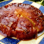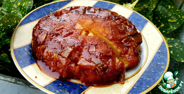 Простенький пирожок, когда нет времени, а хочется сладкого :lol: Я положила одно здоровенное зеленое кислое яблоко... Верх получается вкусненький - карамельный. Форму лучше взять маленького диаметра - получится повыше. У меня была очень большая форма, поэтому получился толщиной с тарт-татен.