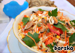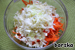 Тонко нашинковать белокочанную капусту. Добавить к салату.