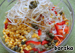 Кукурузу - сцедить, паприку нарезать тонкими полосками. Объединить с салатом. Добавить ростки и каперсы. Перемешать.