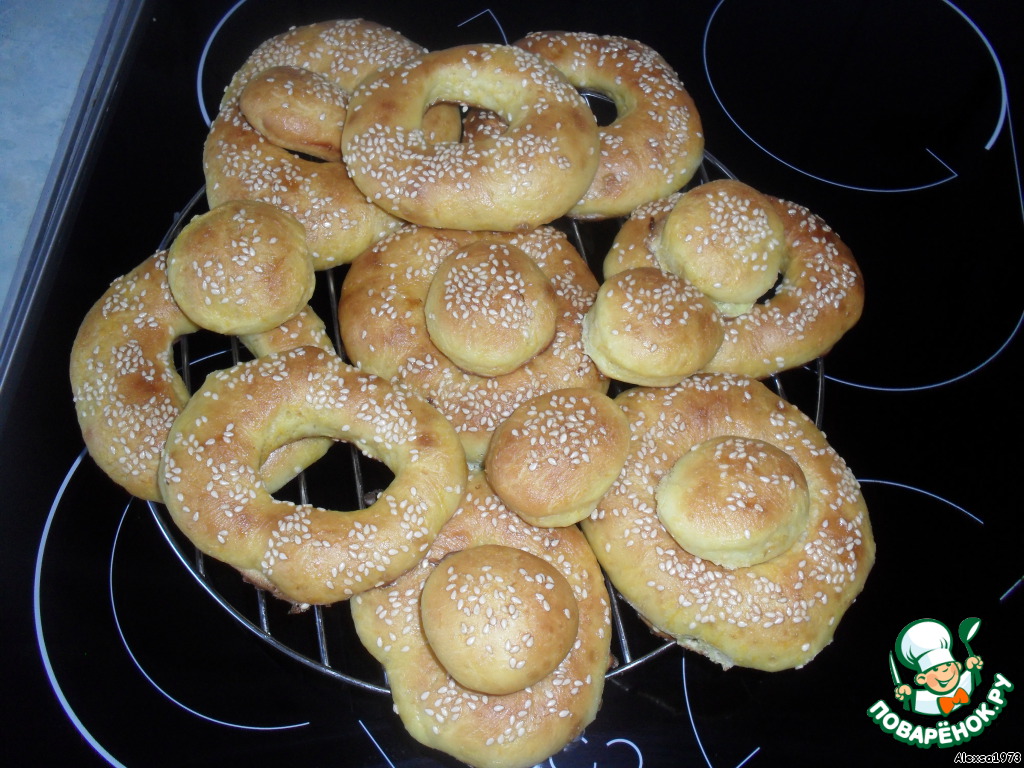 Из теста формируем 8 шариков, раскатываем их, затем с помощью стопочки делаем в центре отверстие. Один бублик сделайте сами, а уж с остальными справятся ваши помощники, ведь "врачами" они смогли быть! Из вынутых серединок сформируйте девятый бублик - безотходное производство. Девять бубликов как раз входят на один стандартный противень. Смажем еще бублики яйцом, обсыпаем кунжутом и в печь на 25 мин. при 200*С