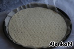Готовим форму для запекания. Выкладываем на нее бумагу для запекания и тесто-основу. Тесто можно использовать покупное или замесить самостоятельно. Для приготовления теста смешать сухие ингредиенты: мука, дрожжи, соль. Добавить масло и подливать воду. Должно получится крутое тесто. Его нужно раскатать под вашу форму, толщиной около 5 мм.