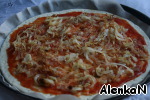 Обжариваем на подсолнечном масле лук. Я предпочитаю резать кольцами на терке - быстро и удобно. Выкладываем жареный лук на пиццу.