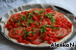 Красный болгарский перец режу кубиками и выкладываю поверх помидоров.