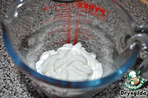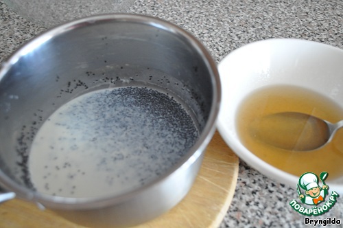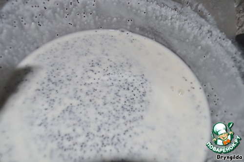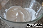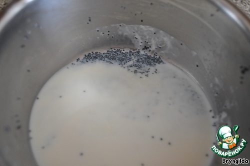 Сметану смешиваю со сливками, ввожу желатин, подготовленный мак и белок.