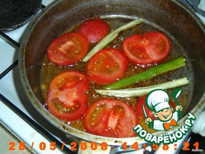 Помидор очистить от кожуры, нарезать кружочками, и стручковый перчик, чуть обжарить.