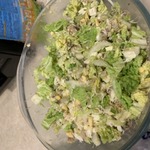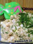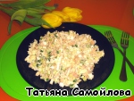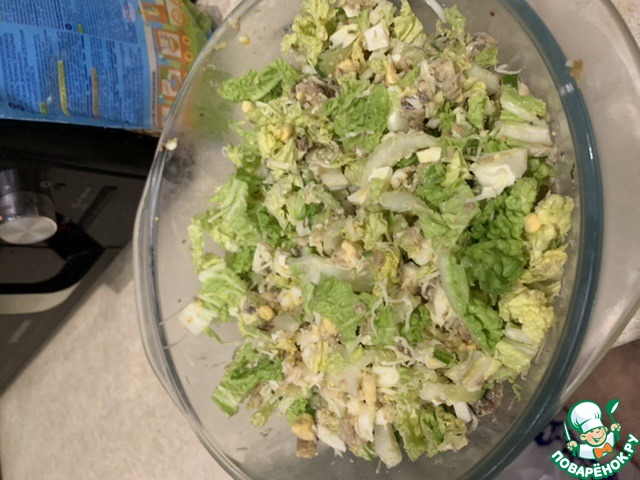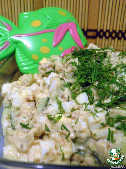 Рыбу разбираем, кости нам в салате ни к чему. Жидкость я оставляю, она - часть заправки. Яйца отварить, порубить. Огурец порезать кубиками, лук - порезать и ошпарить кипятком. Капусту нашинковать, присолить и немного помять. Сыр натереть (я люблю на мелкой терке, чтобы в салате не попадались ощутимые кусочки сыра, но это кому как нравится).