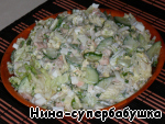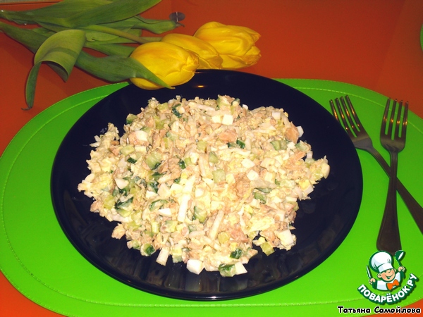 Опять же, все это можно сделать заранее, порезать огурчик только в последний момент. И перемешать. Салат готов за 5 минут...