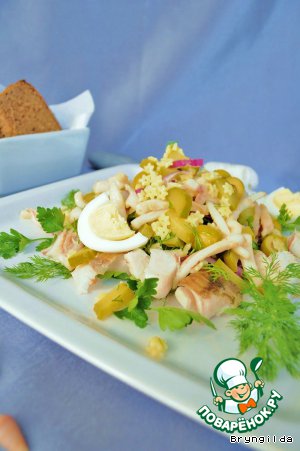 Рецепт «Теплый салат из кальмаров, минтая и орзо»: