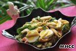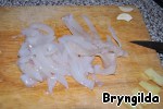 Кальмара нарезать соломкой, чеснок разрезать пополам, имбирь разрезать на кусочки.