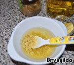Для заправки - чеснок натереть на мелкой терке, добавить горчицу, 1 ч.л. сока лимона и оливковое масло, все перемешать.