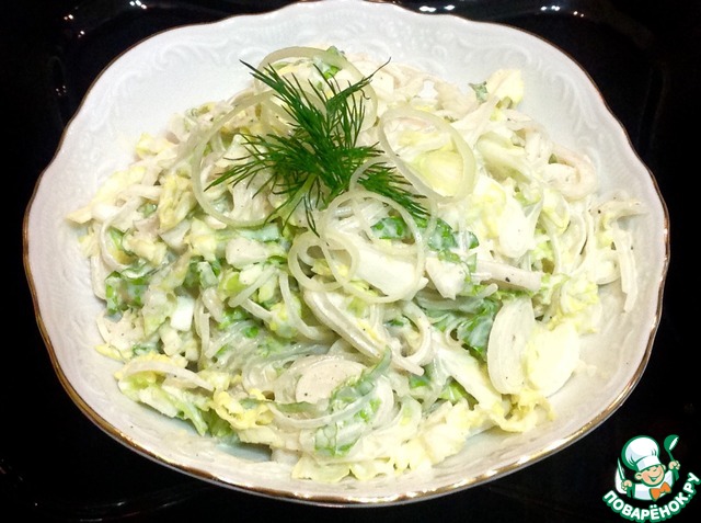 Потом сделала как-то по памяти вариацию на салат из того, что дома было - яйцо, капуста пекинская, фунчоза и обычный лук, яйца при этом потерла, а не порезала, заправила майонезом, без кальмаров обошлась - салат исчез моментально! Теперь так иногда и делаю )