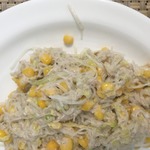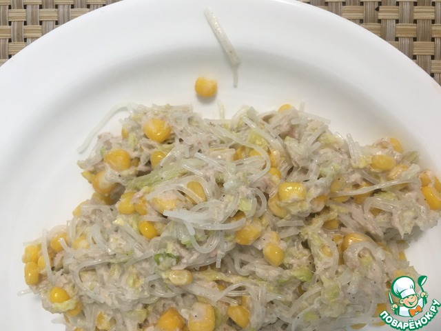 Внесла свои дополнения: за кальмарами было лень идти и я добавила в вместо них баночку тунца в собственном соку; яйца не ем и потому добавила чёрную четверговую соль, она даёт вкус яиц; уж очень у меня в салат просилась кукурузка бондюэль, тоже добавила баночку; и добавила 1 вязанку фунчозы. Заправка: майонез постный и туда потёрла чеснок свежий. Все!!