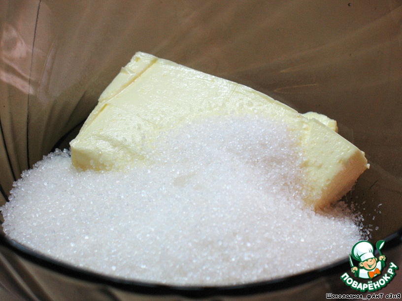 Размягченное сливочное масло взбивайте с сахаром до растворения кристаллов (первый раз я это сделала блендером-насадка "венчик", масло расслоилось на хлопья, поэтому второй раз я проделала эту процедуру вручную),