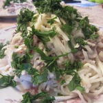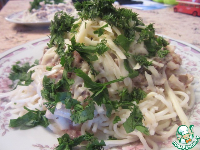 На тарелку в виде гнезда выкладываем спагетти и делаем в серединке углубление, в него выкладываем нашу поджарку, немного присыпаем тертым сыром и зеленью. И ву а ля!