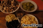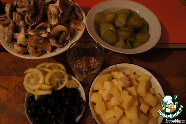 В финале добавляем все оставшиеся ингредиенты: огурцы, маслины, лимон и очень желательно положить зелень укропа, хотя бы, сухого.