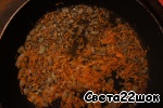 Лук соединяем с морковью, выкладываем на сковороду с растительным маслом и пассеруем до появления золотистой корочки. Добавляем в суп зажарку.