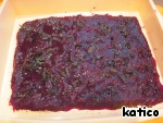 Свеклу выложить тонким слоем в форме прямоугольника, сверху - чернослив в произвольном порядке, сверху аккуратно и равномерно полить свекольным соком с желатином и оставить на холод до полного застывания.