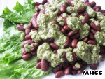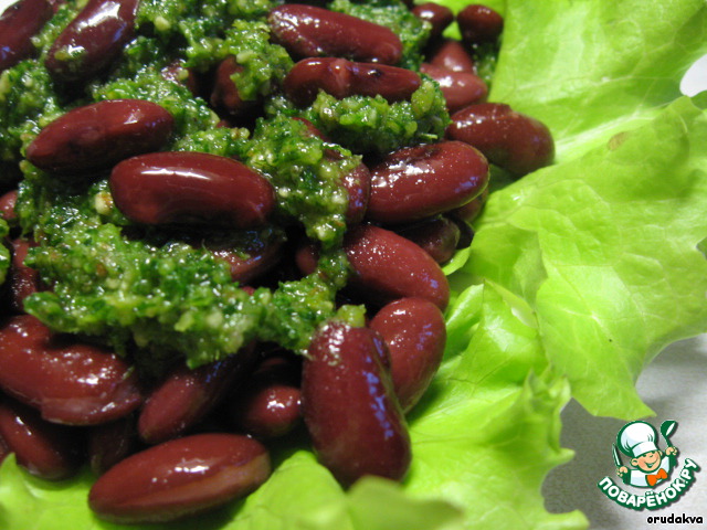 На сервировочное блюдо выкладываем листья салата, на них фасоль.