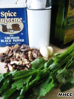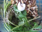 Сначала измельчаем в блендере кинзу, чеснок и грецкие орехи, туда же сразу можно добавить соль и перец. Запах при этом умопомрачительный.