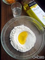 Добавить оливковое масло (можно другое), немного вмешать масло в муку. -