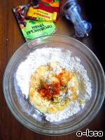 Муку просеять, добавить разрыхлитель, 1/2 ч.л. сахара, перемешать.