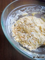 Добавить хлопья и вымешать до однородности, тесто будет слегка жидковато, если оно слишком "крутое", можно ещё немного добавить воды.