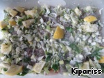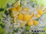 Готовим маринад. Режем лук, укроп, петрушку, базилик не очень мелко. Также нарезаем на небольшие кусочки лимон, вливаем кокосовое молоко и хорошо перемешиваем.