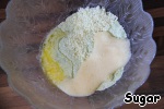 Сначало смешать муку, орехово-сахарную смесь, разрыхлитель.
