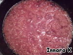 В разогретую сковороду влить масло, добавить размолотый рис, на медленном огне тушить 7-10 мин, пока рис не станет бежевым, добавить разведенную томат-пасту и тушить ещё 10-15 мин.
